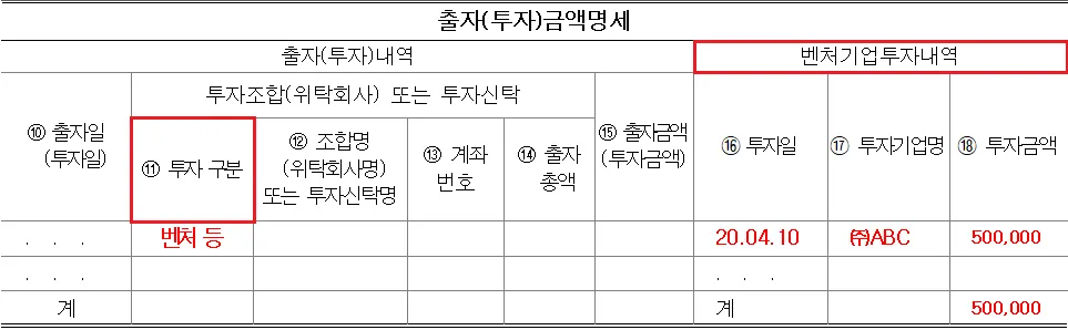 3. 출자(투자)금액명세 항목 중 ⑪ 투자 구분과 벤처기업투자내역 정보만 기재해주시면 됩니다.