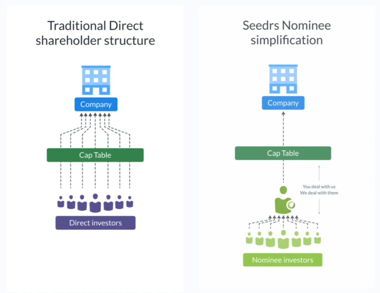 대표적인 유럽의 크라우드펀딩 회사들인 Seeders 나 crowdcube의 경우 위와 동일한 이유로 중개업자의 역할에 대해서 강조하면서 nominee structure 라는 간접투자 방식의 크라우드펀딩을 진행하고 있습니다. 투자자가 회사의 직접 주주가 되는 방식이 아니라 별도의 중간단계(여기서는 신탁)를 하나 더 두는 방식입니다. 중개회사가 이를 통해 투자자들의 이익과 권리행사를 대리합니다. 아래는 Seeders의 nominee structure 입니다.